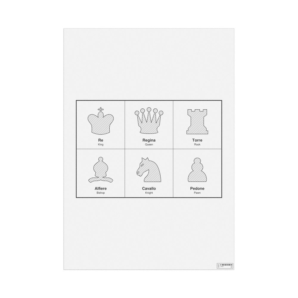 A poster of the chess pieces in Italian (Pezzi degli scacchi) with English translations.