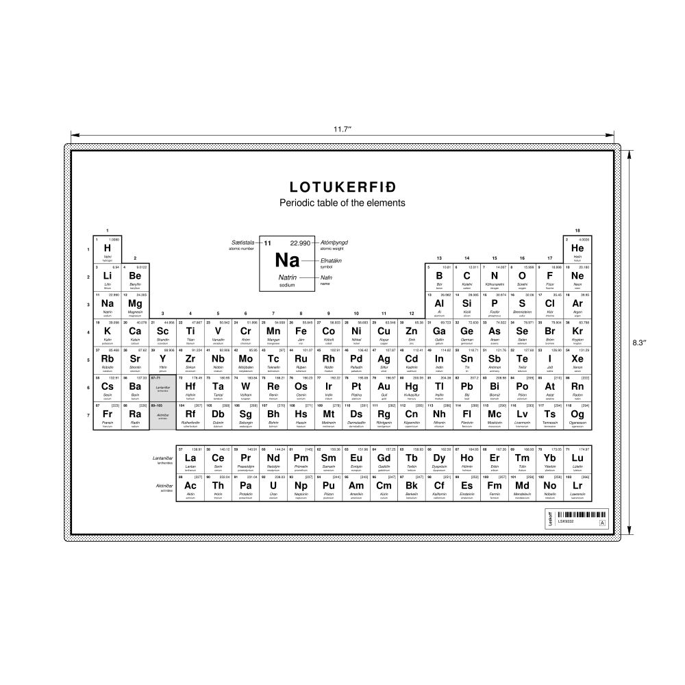 A periodic table chart in Icelandic (Lotukerfið) with English translations in the 11.7 x 8.3 in (29.7 x 21.0 cm, desk chart, laminated) format. 18-column layout featuring the atomic numbers, atomic weights, symbols, and names of all chemical elements.