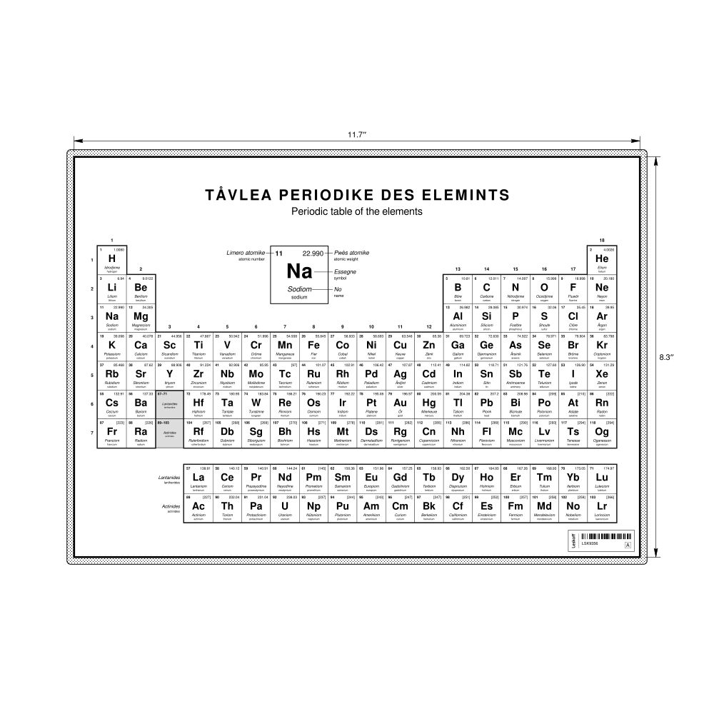 A periodic table chart in Walloon (Tåvlea periodike des elemints) with English translations in the 11.7 x 8.3 in (29.7 x 21.0 cm, desk chart, laminated) format. 18-column layout featuring the atomic numbers, atomic weights, symbols, and names of all chemical elements.