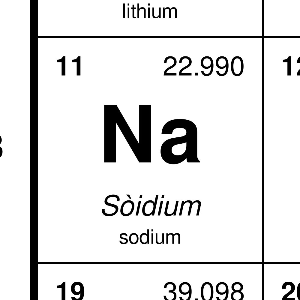 A Scottish Gaelic-language periodic table of the elements with English translations.