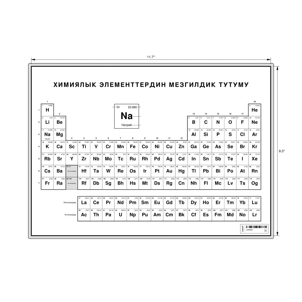 A periodic table chart in Kyrgyz (Химиялык элементтердин мезгилдик тутуму) in the 11.7 x 8.3 in (29.7 x 21.0 cm, desk chart, laminated) format. 18-column layout featuring the atomic numbers, atomic weights, symbols, and names of all chemical elements.