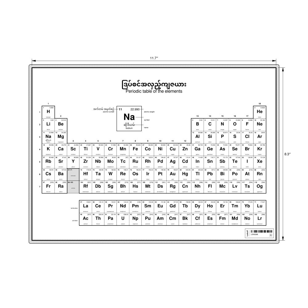 Periodic Table Chart11.7 x 8.3 in (29.7 x 21.0 cm, Desk Chart, Laminated), 18-Column Layout, Burmese/English-Labeled