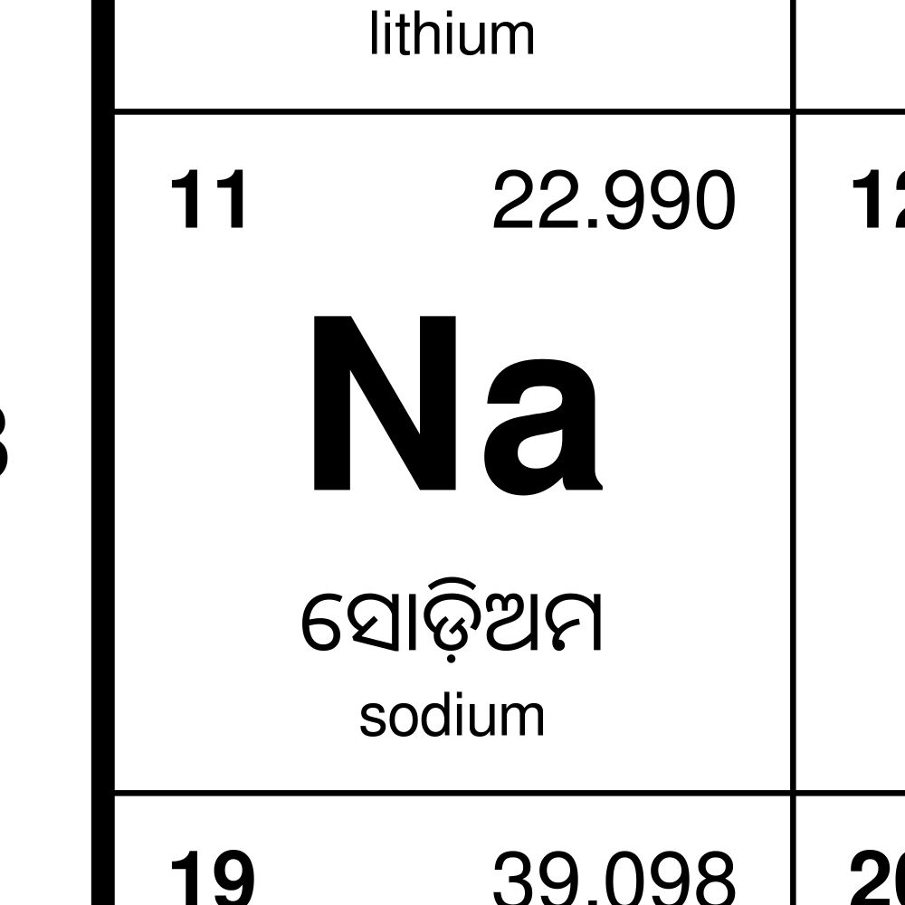 A periodic table chart in Odia (ପର୍ଯ୍ୟାୟ ସାରଣୀ) with English translations in the 11.7 x 8.3 in (29.7 x 21.0 cm, desk chart, laminated) format. 18-column layout featuring the atomic numbers, atomic weights, symbols, and names of all chemical elements.