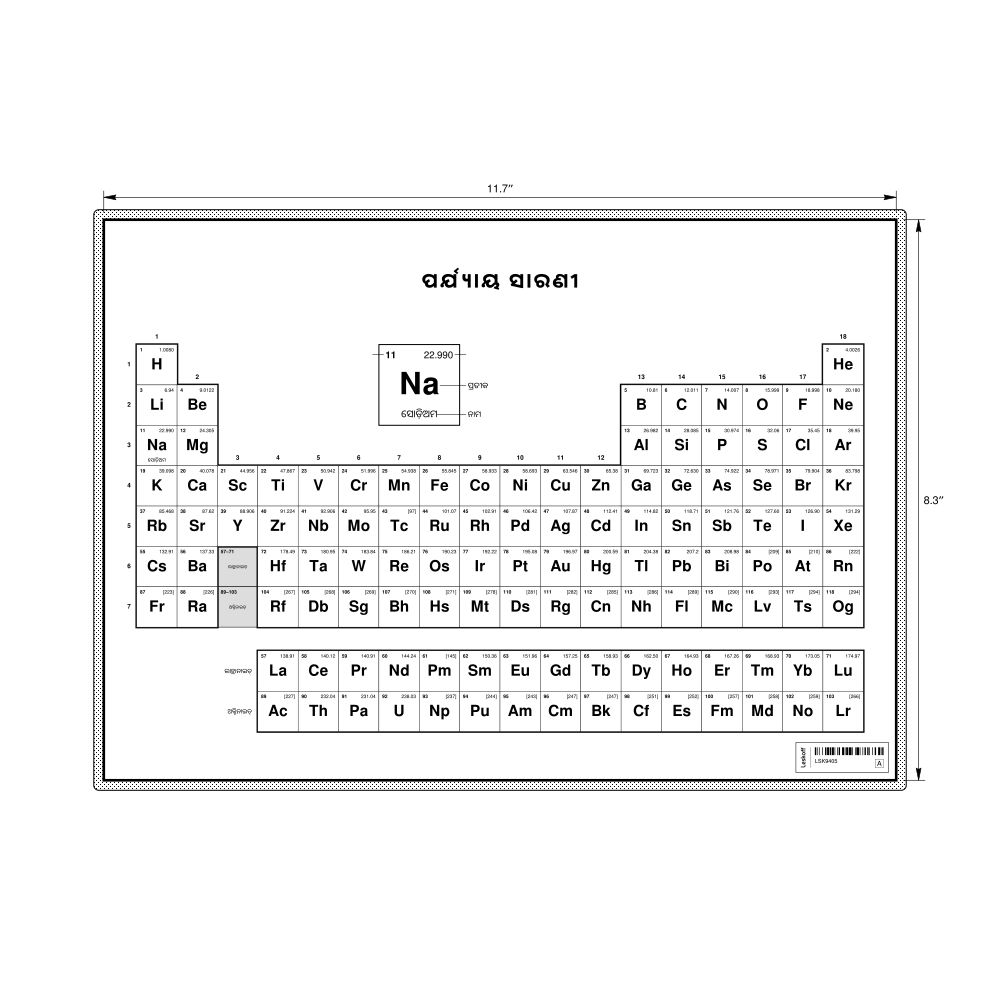 A periodic table chart in Odia (ପର୍ଯ୍ୟାୟ ସାରଣୀ) in the 11.7 x 8.3 in (29.7 x 21.0 cm, desk chart, laminated) format. 18-column layout featuring the atomic numbers, atomic weights, symbols, and names of all chemical elements.