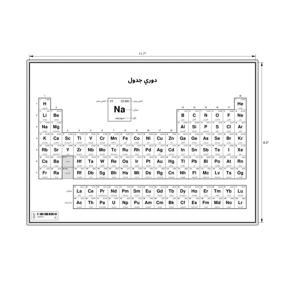 A periodic table chart in Sindhi (دوري جدول) in the 11.7 x 8.3 in (29.7 x 21.0 cm, desk chart, laminated) format. 18-column layout featuring the atomic numbers, atomic weights, symbols, and names of all chemical elements.