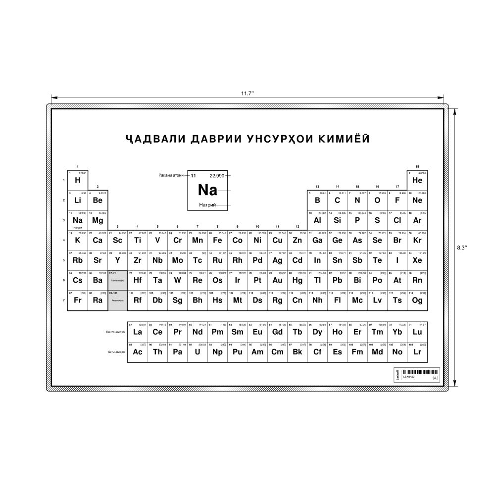 A periodic table chart in Tajik (Ҷадвали даврии унсурҳои кимиёӣ) in the 11.7 x 8.3 in (29.7 x 21.0 cm, desk chart, laminated) format. 18-column layout featuring the atomic numbers, atomic weights, symbols, and names of all chemical elements.