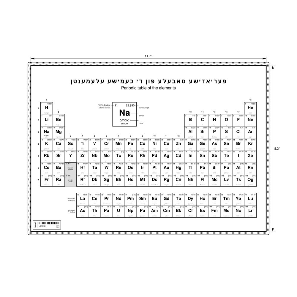 A periodic table chart in Yiddish (פעריאדישע טאבעלע פון די כעמישע עלעמענטן) with English translations in the 11.7 x 8.3 in (29.7 x 21.0 cm, desk chart, laminated) format. 18-column layout featuring the atomic numbers, atomic weights, symbols, and names of all chemical elements.
