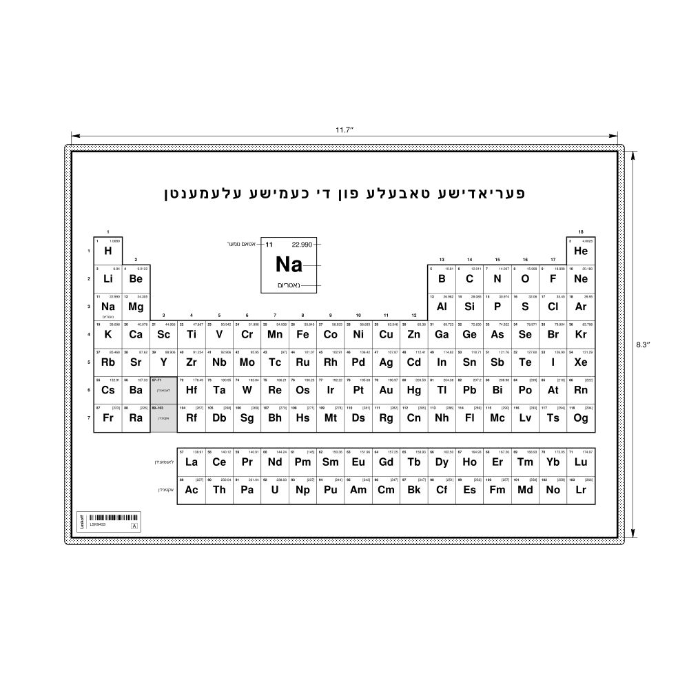 A periodic table chart in Yiddish (פעריאדישע טאבעלע פון די כעמישע עלעמענטן) in the 11.7 x 8.3 in (29.7 x 21.0 cm, desk chart, laminated) format. 18-column layout featuring the atomic numbers, atomic weights, symbols, and names of all chemical elements.