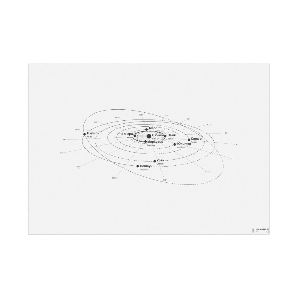 A poster of the Solar System in Bulgarian (Слънчева система) with English translations.