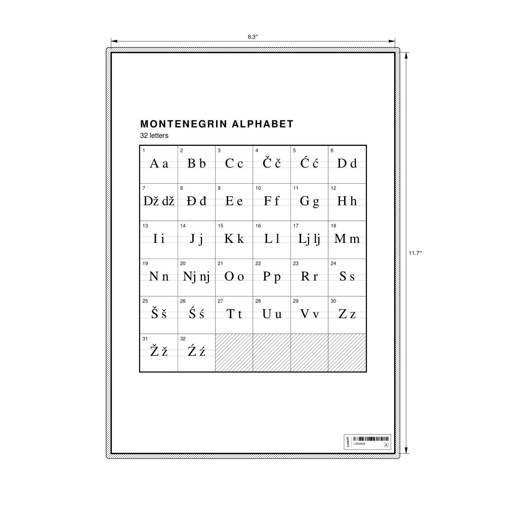 The Montenegrin alphabet chart (the full set of letters) in the 8.3 x 11.7 in (21.0 x 29.7 cm, desk chart, laminated) format.