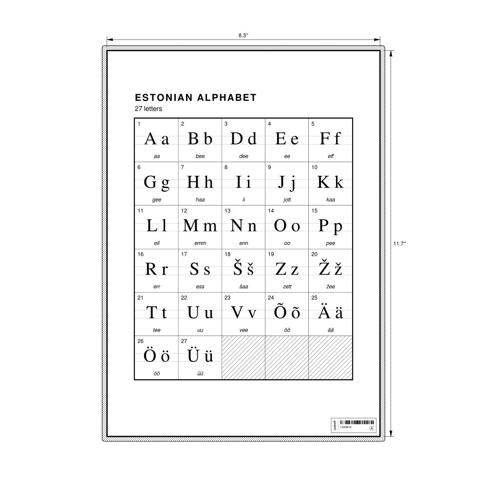 Estonian Alphabet Chart8.3 x 11.7 in (21.0 x 29.7 cm, Desk Chart, Laminated)