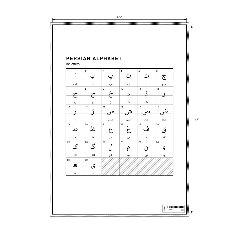 The Persian alphabet chart (the full set of letters) in the 8.3 x 11.7 in (21.0 x 29.7 cm, desk chart, laminated) format.