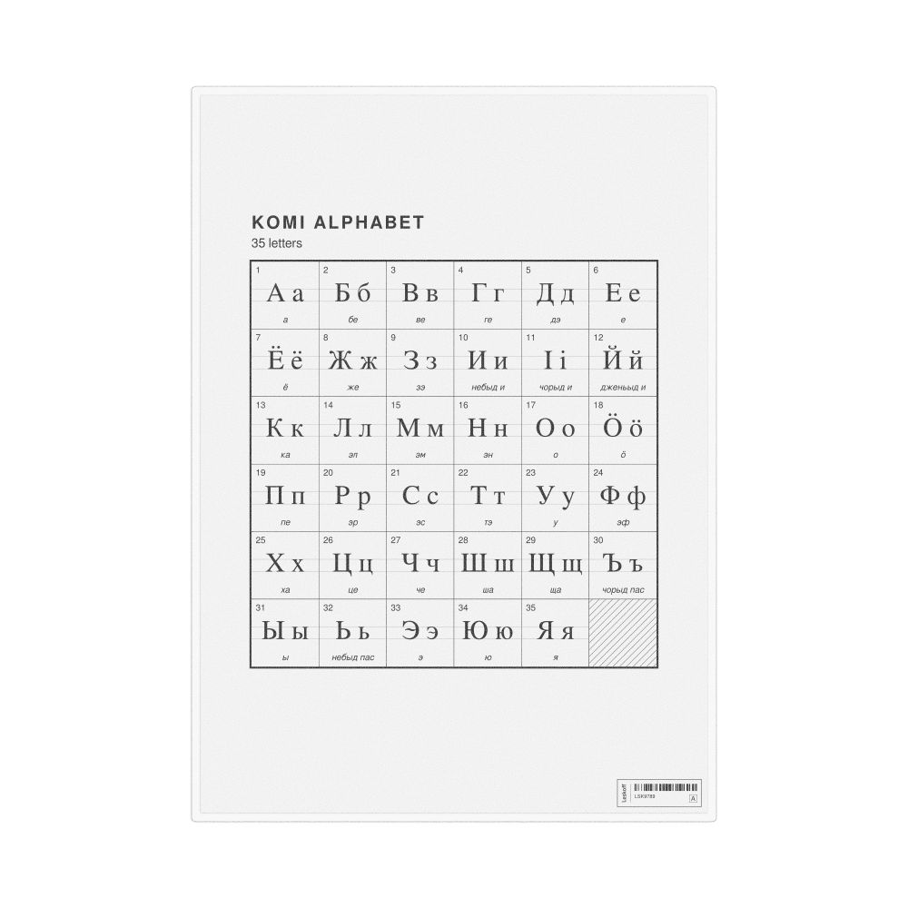 The Komi alphabet chart (the full set of letters) in the 8.3 x 11.7 in (21.0 x 29.7 cm, desk chart, laminated) format.