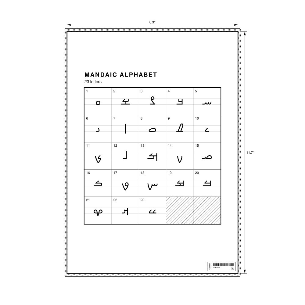 The Mandaic alphabet chart (the full set of letters) in the 8.3 x 11.7 in (21.0 x 29.7 cm, desk chart, laminated) format.