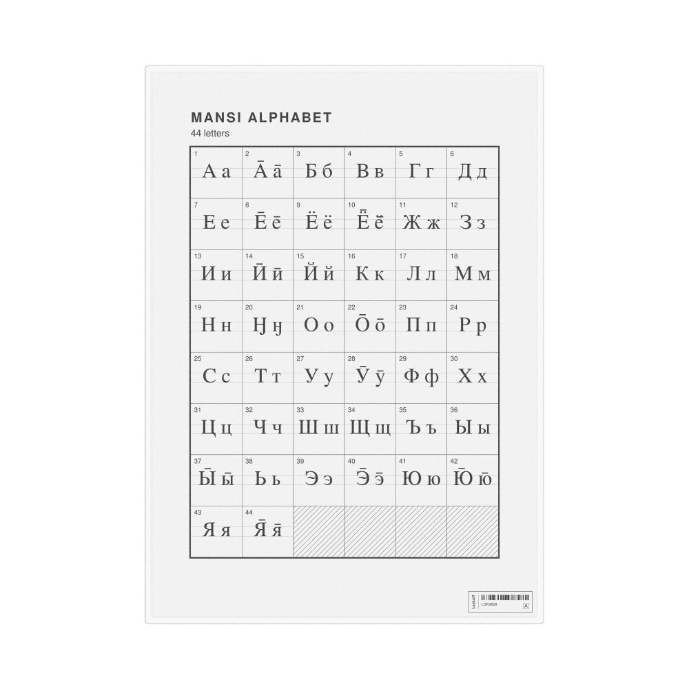 The Mansi alphabet chart (the full set of letters) in the 8.3 x 11.7 in (21.0 x 29.7 cm, desk chart, laminated) format.