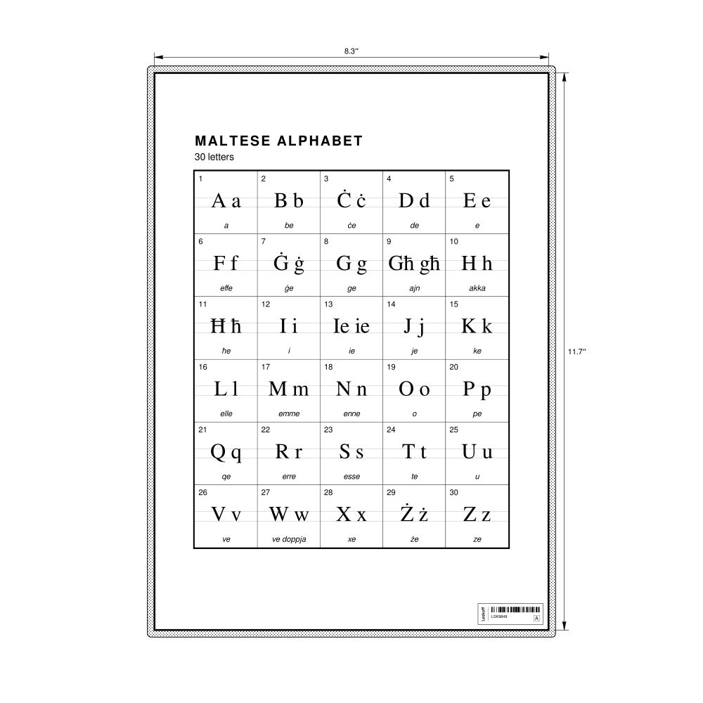 The Maltese alphabet chart (the full set of letters) in the 8.3 x 11.7 in (21.0 x 29.7 cm, desk chart, laminated) format.