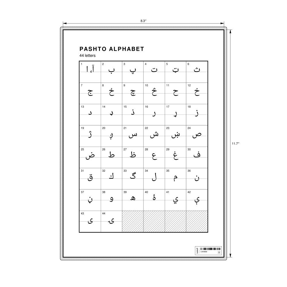 The Pashto alphabet chart (the full set of letters) in the 8.3 x 11.7 in (21.0 x 29.7 cm, desk chart, laminated) format.