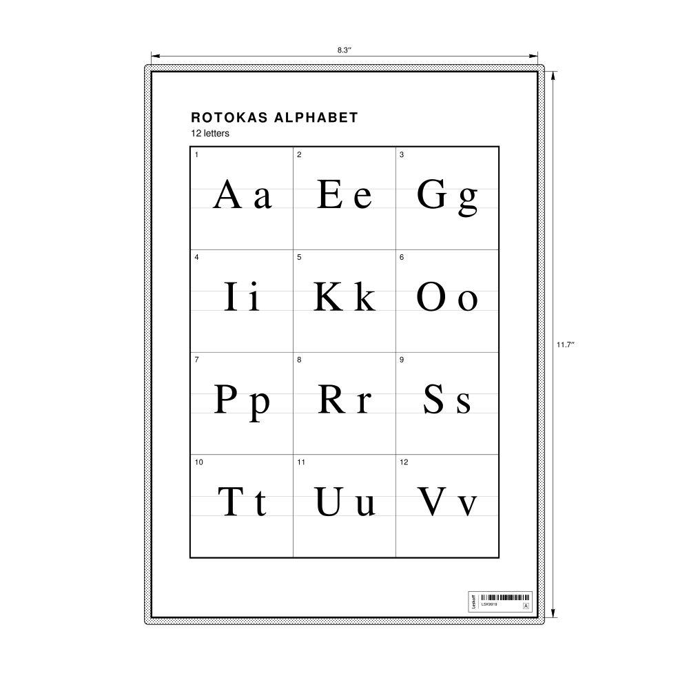 The Rotokas alphabet chart (the full set of letters) in the 8.3 x 11.7 in (21.0 x 29.7 cm, desk chart, laminated) format.
