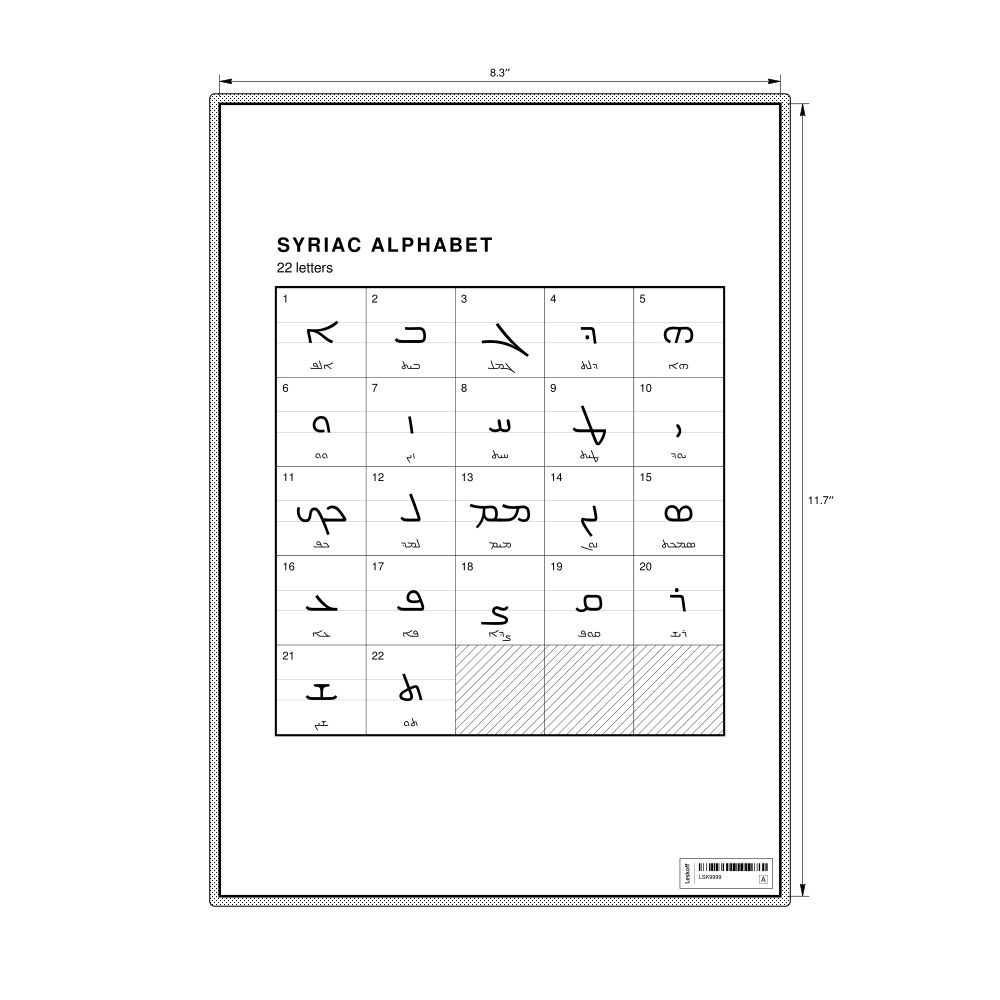 The Syriac alphabet chart (the full set of letters) in the 8.3 x 11.7 in (21.0 x 29.7 cm, desk chart, laminated) format.
