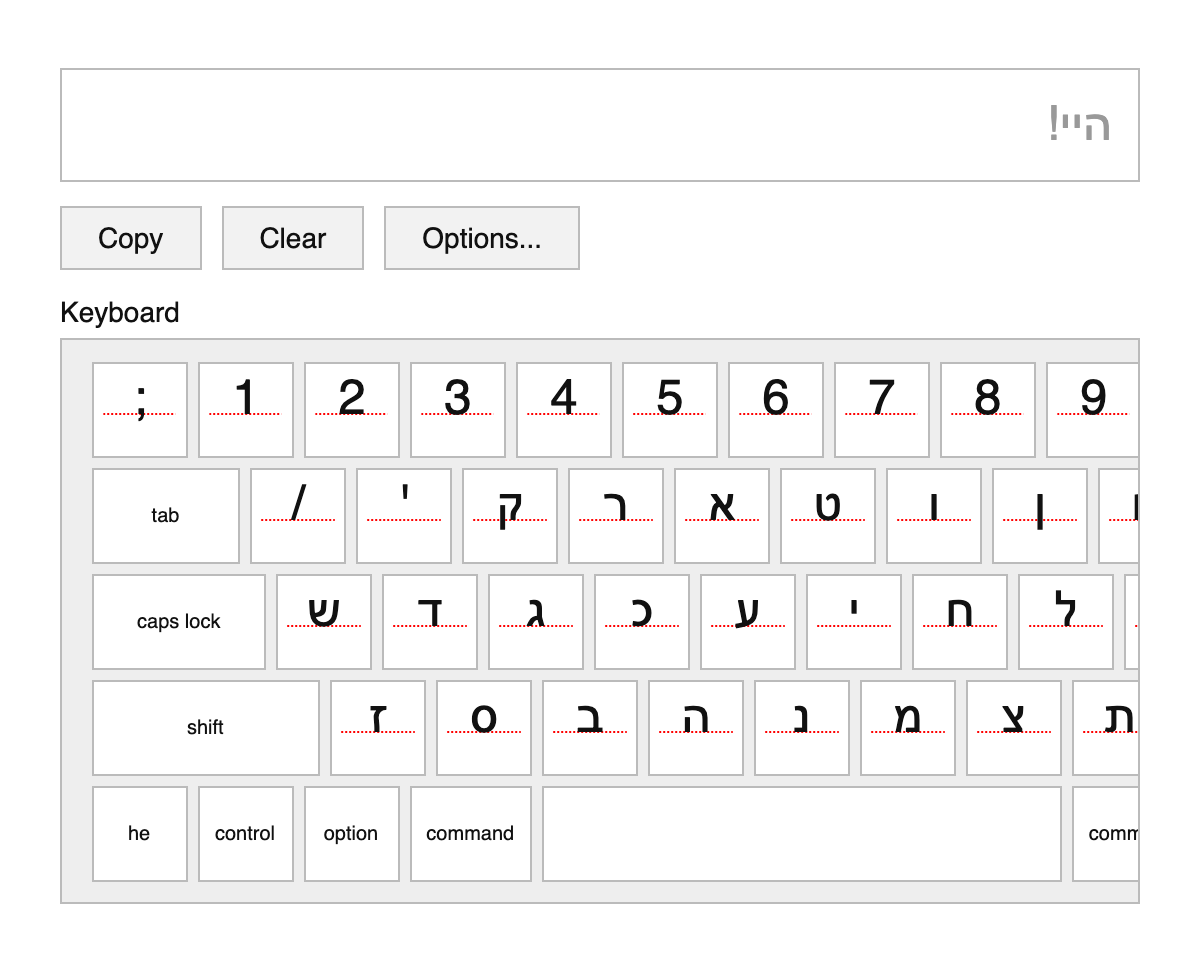 An on-screen/virtual Hebrew keyboard for typing Hebrew text.