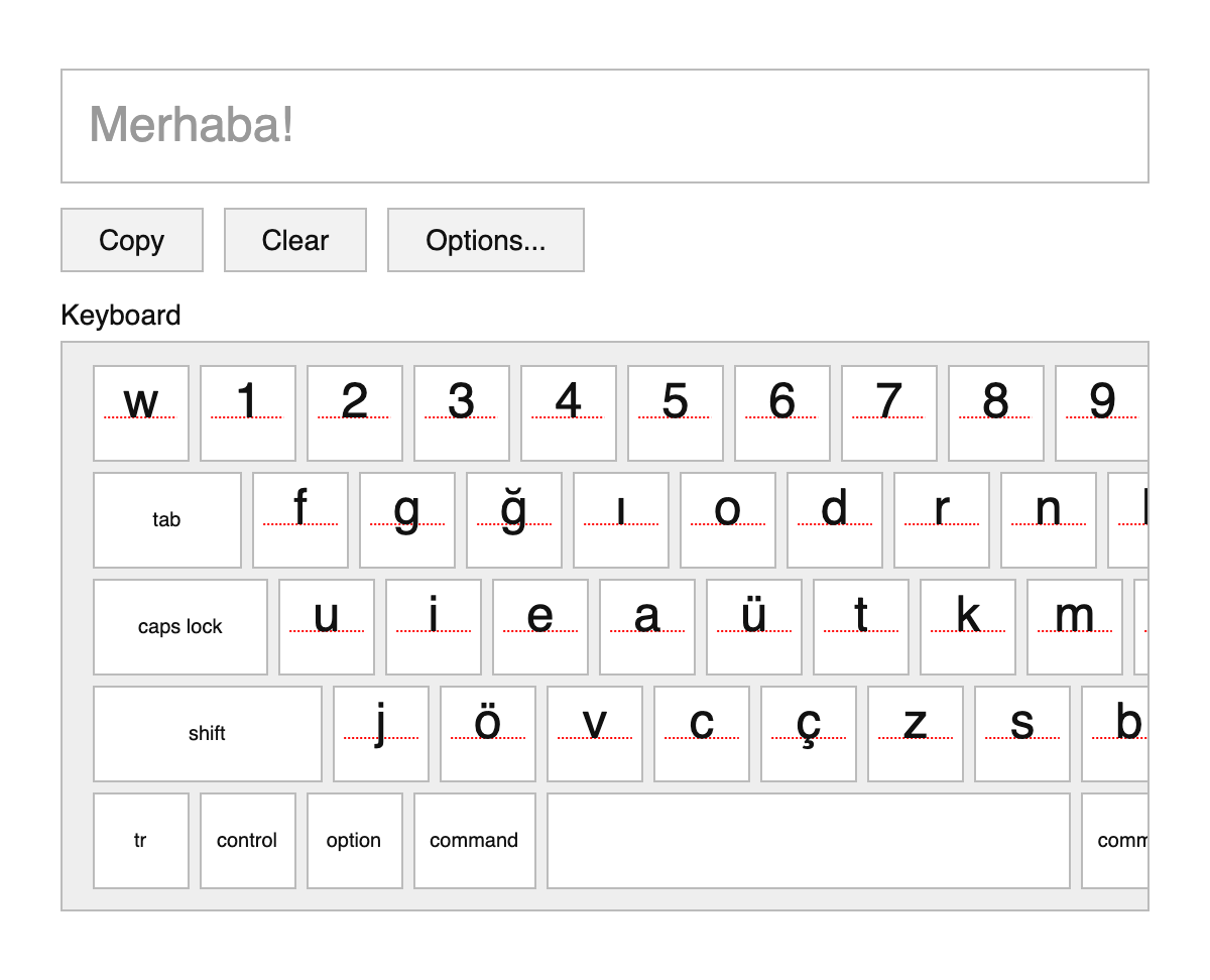 An on-screen/virtual Turkish keyboard for typing Turkish text.