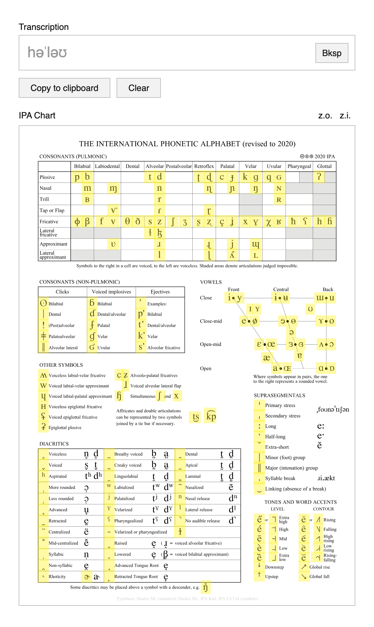View the International Phonetic Alphabet chart (revised to 2020) and write phonetic transcriptions by clicking on the symbols.