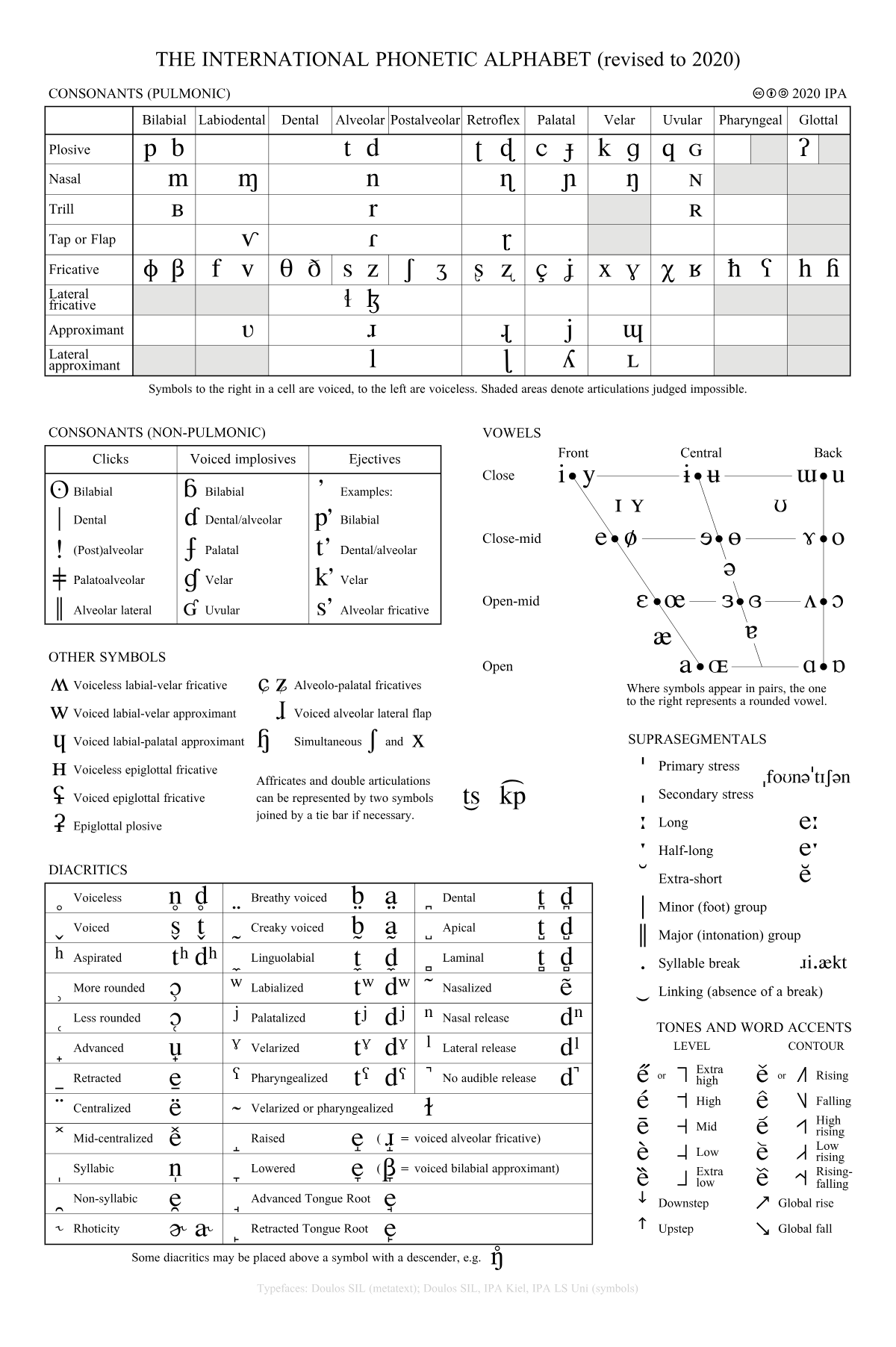 The International Phonetic Alphabet chart (revised to 2020) with audio pronunciations. Click on the symbols to hear the sounds.