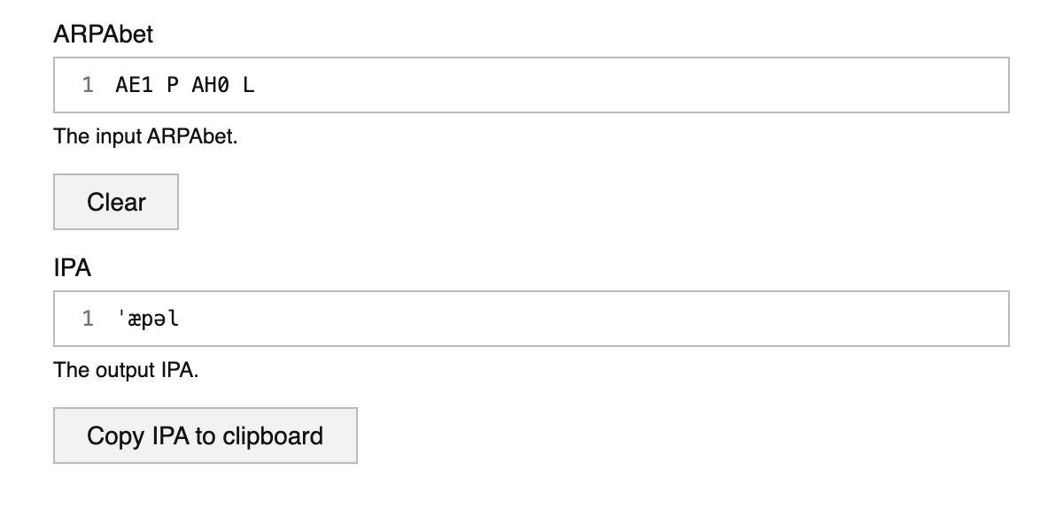 This tool converts ARPAbet phonetic notation to International Phonetic Alphabet (IPA).