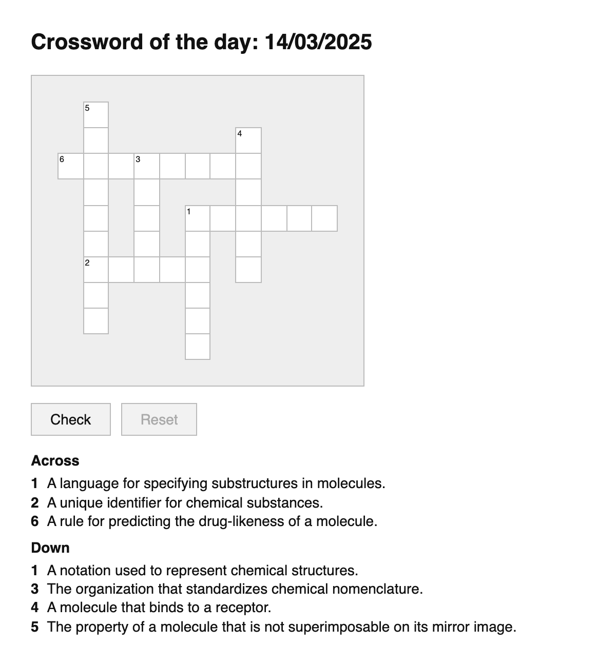 A daily crossword puzzle for cheminformatics terms.