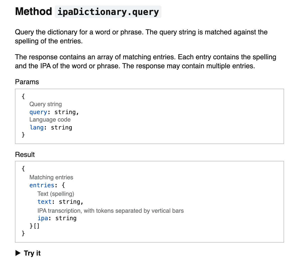 The response contains an array of matching entries. Each entry contains the spelling and the IPA of the word or phrase. The response may contain multiple entries.