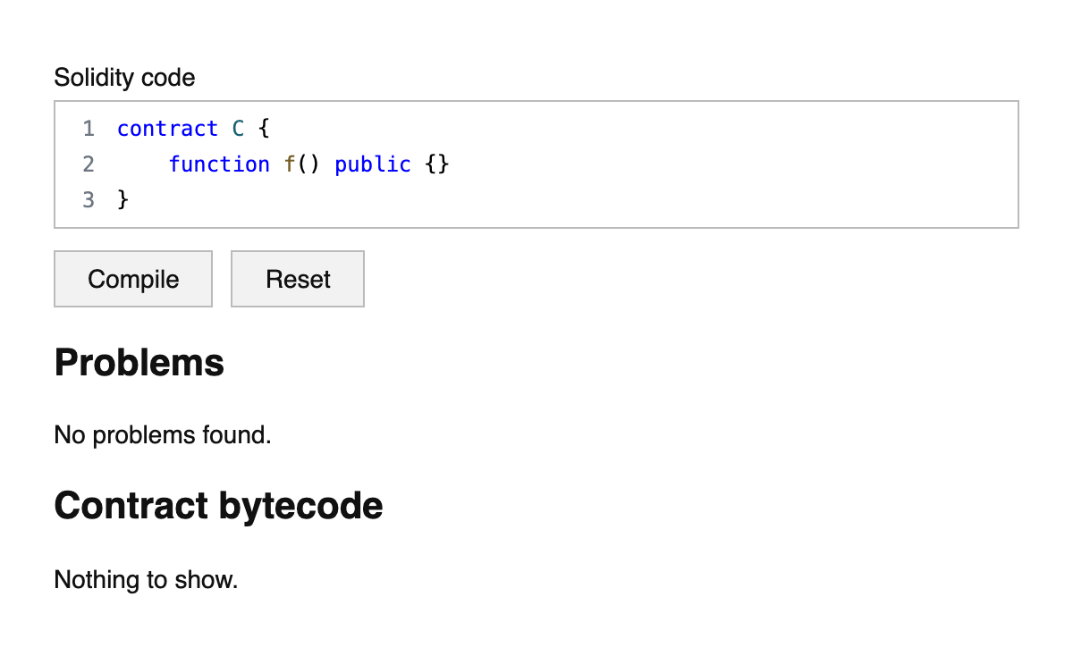 An online compiler for Solidity code. Click the "Compile" button to compile the Solidity code to EVM bytecode.