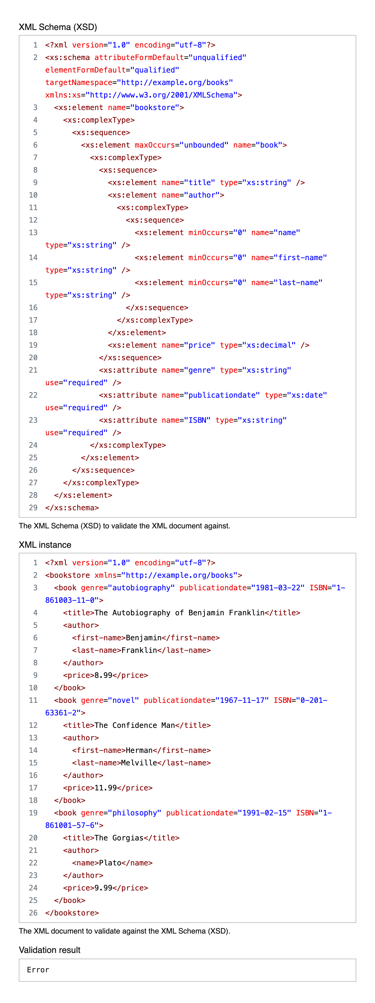 <xs:attribute name = "ISBN" type = "xs:string" use = "required" /> The XML Schema (XSD) to validate the XML document against.