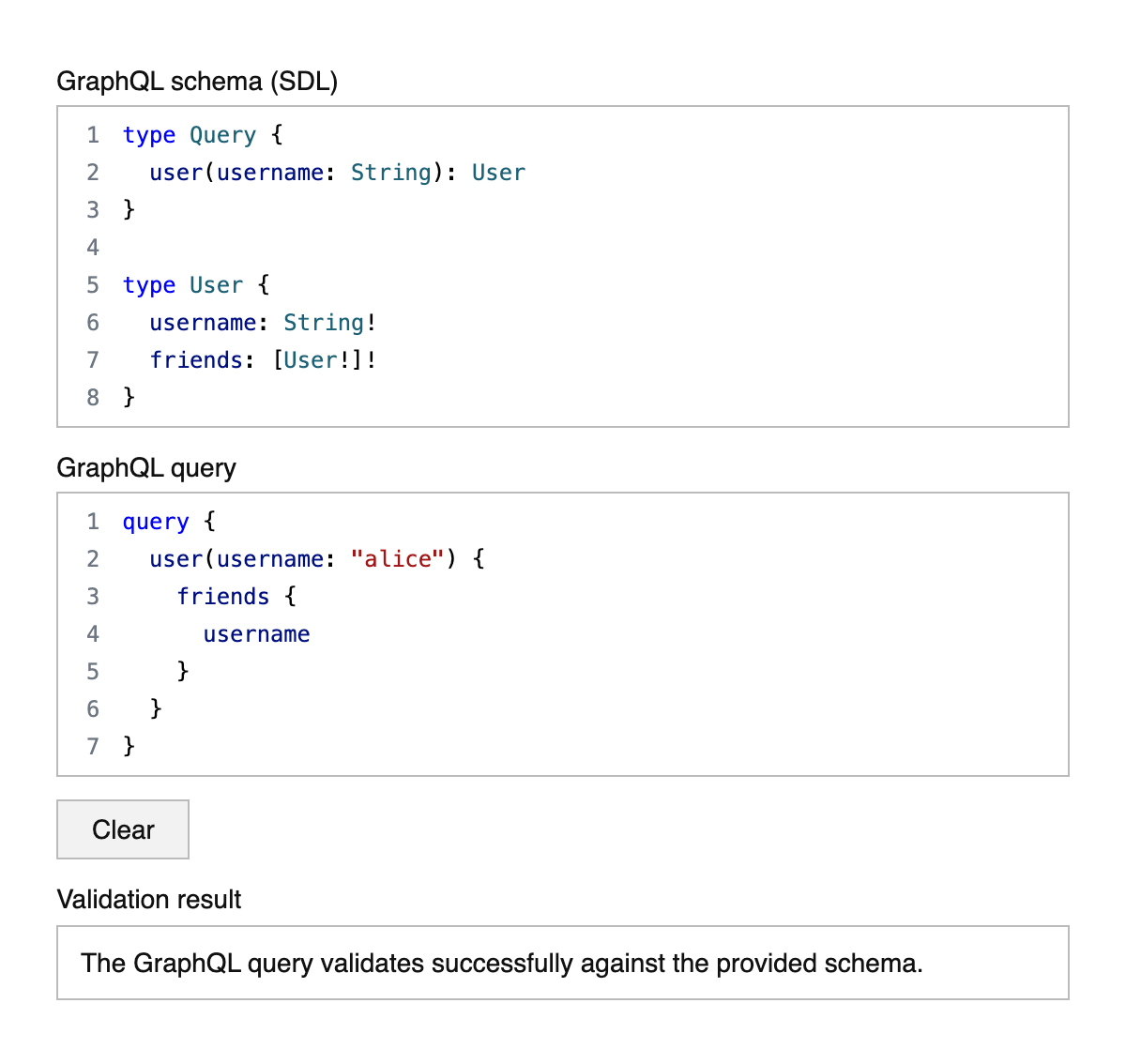 The GraphQL query validates successfully against the provided schema.