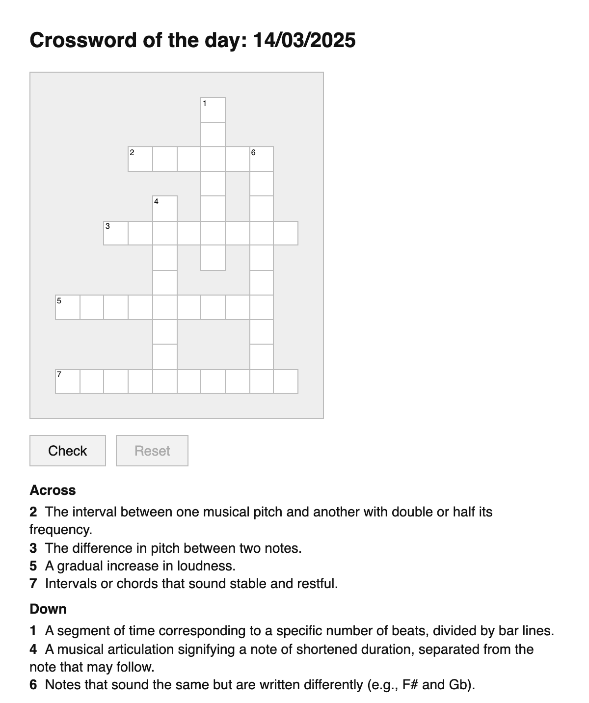 A daily crossword puzzle for music theory terms.