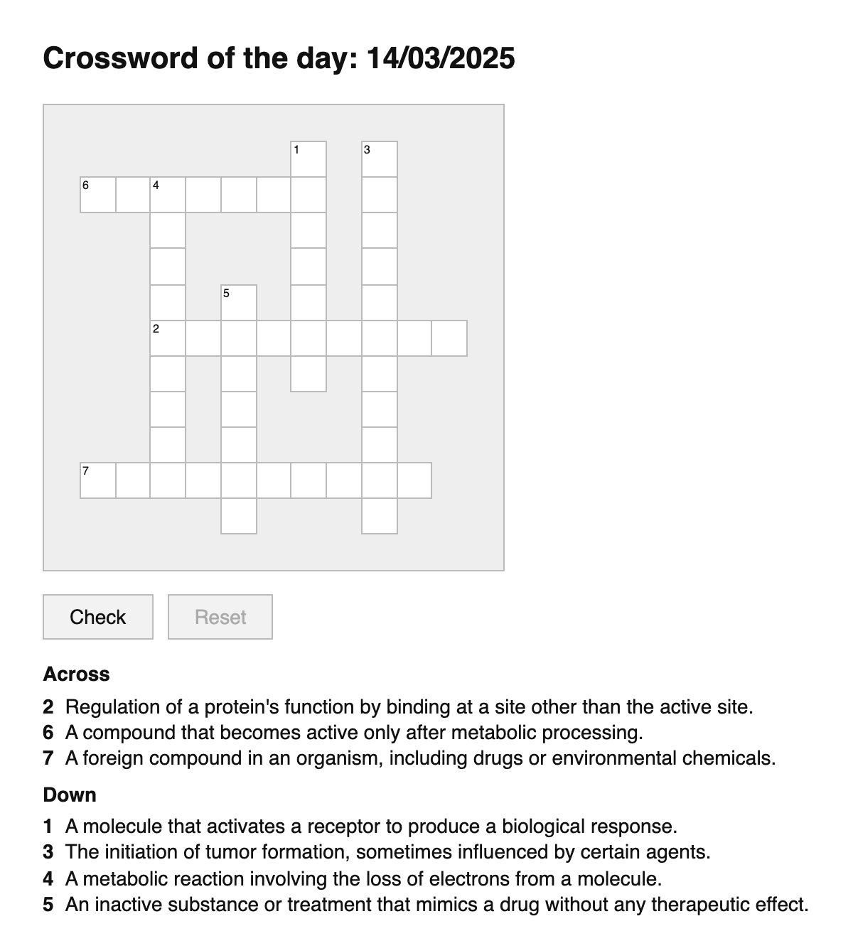 A daily crossword puzzle for pharmacology terms.
