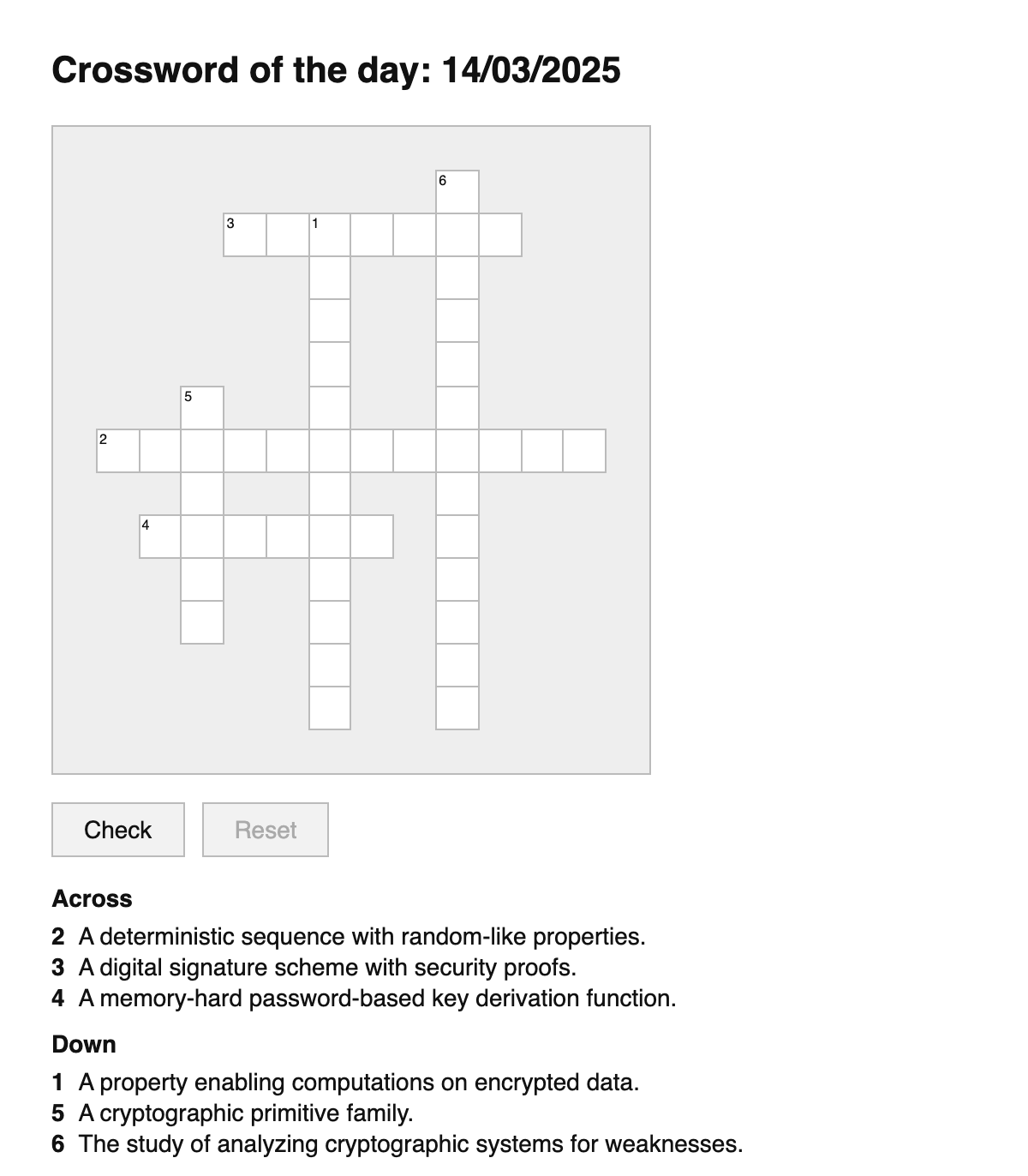 A daily crossword puzzle for cryptography terms.