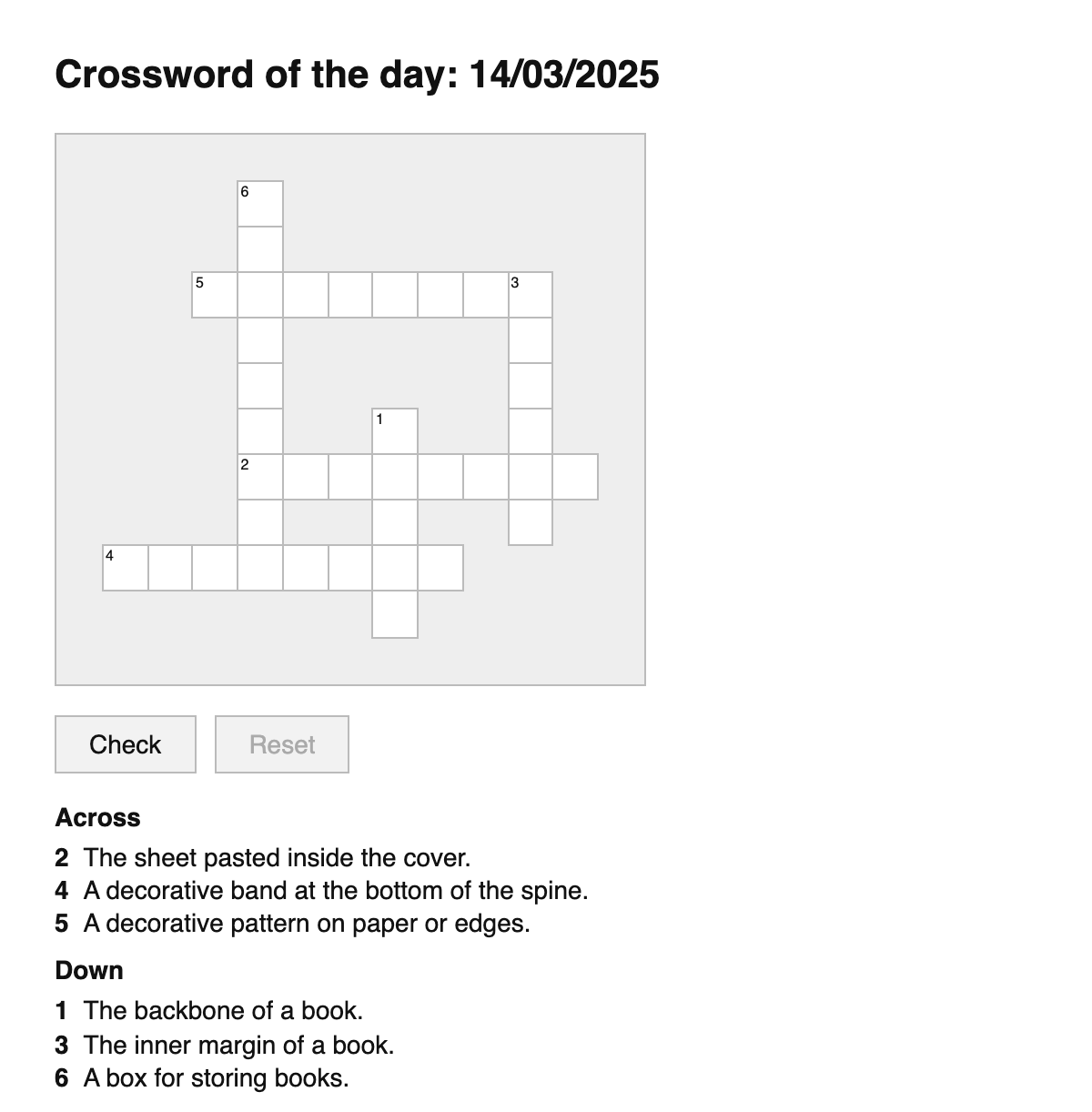 A daily crossword puzzle for bookbinding terms.
